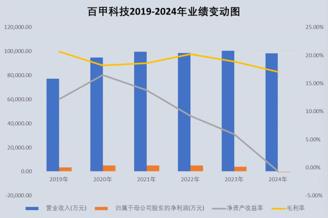 据百甲科技公开信息显示,,2022-2024年,百甲科技营业收入分别为98,441.01万元、100,435.85万元、98,340.60万元,归母净利润分别为4,968.30万元、4,012.14万元、-449.68万元,毛利率分别为20.21%、18.91%、17.08%,净资产收益率分别为9.24%、5.95%、-0.63%。尽管营业收入徘徊在9.8亿元至10亿元之间,但其归母净利润却呈现断崖式下跌,同期,毛利率与净资产收益率(ROE)亦连年下滑,百甲科技的持续盈利能力值得拷问。